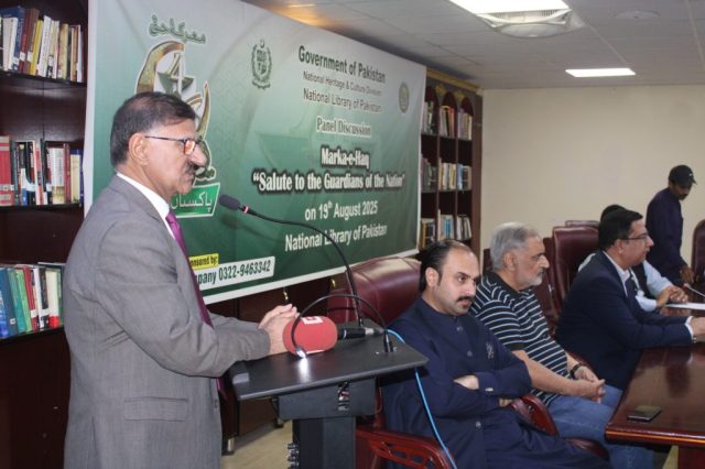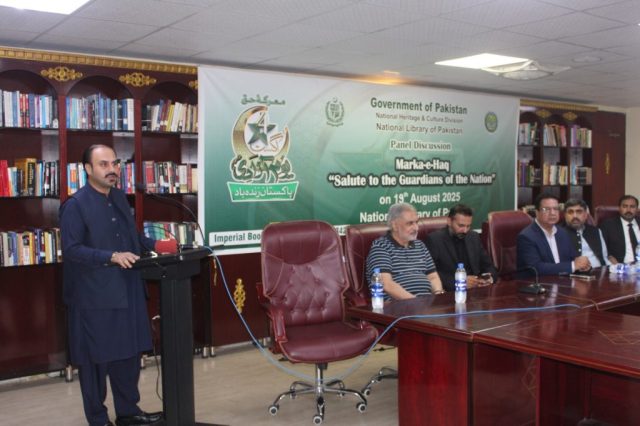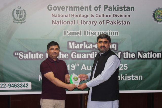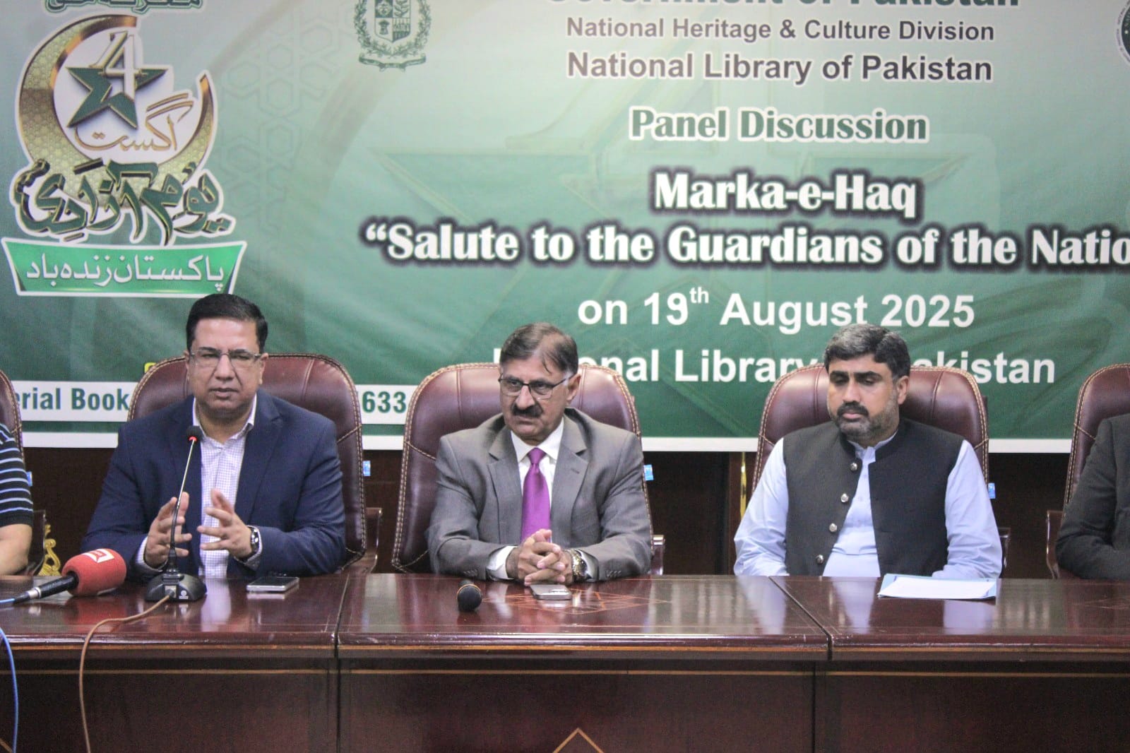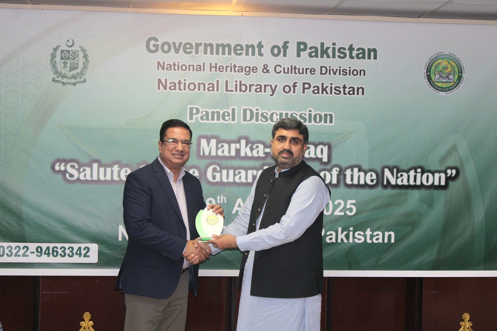 On August 19, 2025, an insightful panel discussion titled “Marqa-e-Haq; Salute to Guardians of the Nation” was held at the National Library of Pakistan, Islamabad. The event was organized by the National Heritage and Culture Division, Government of Pakistan and it was moderated by Mr. Khalid Taimur Akram, CEO of RK Consultants, who also extended his support to the National Library of Pakistan in organizing this significant discussion and made it more impactful.