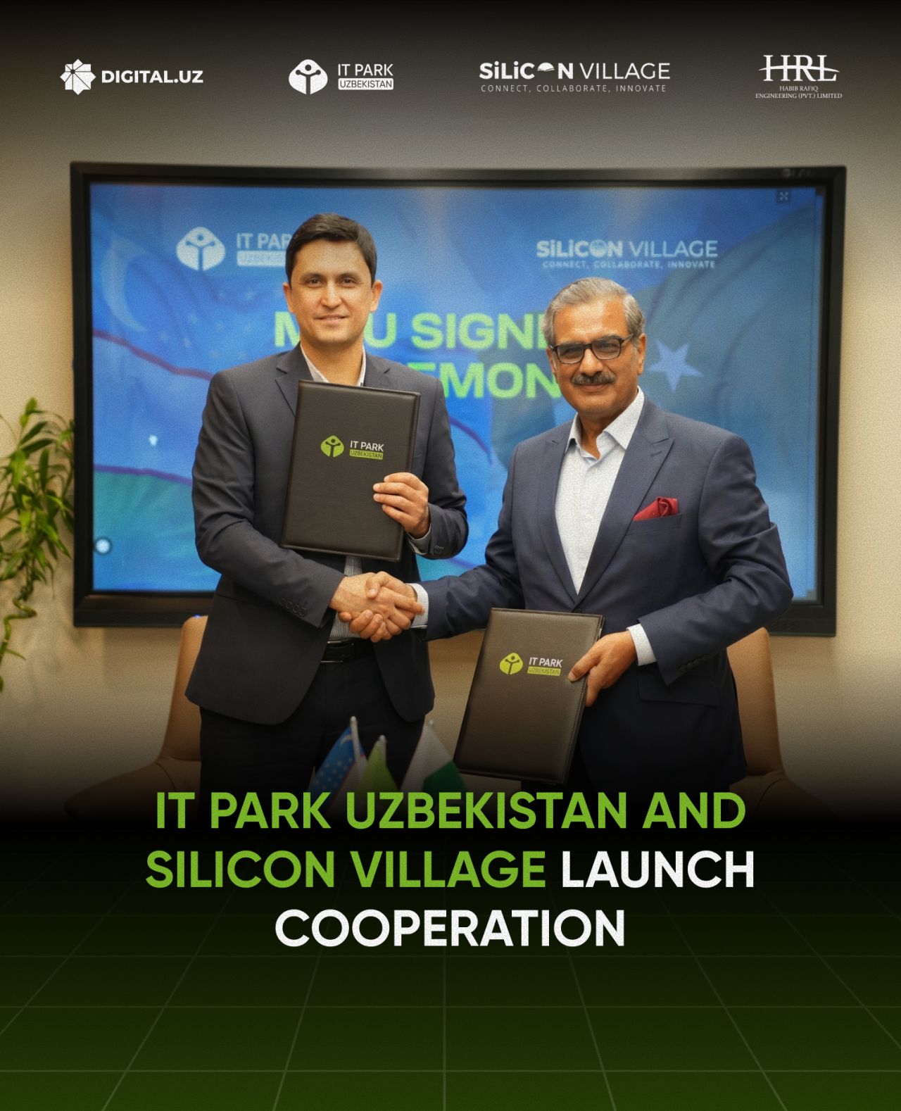 On 27 April 2026, representatives of IT Park Uzbekistan, led by Deputy General Director for Resident Affairs Mr. Lazizbek Khudaev, held a high-level meeting with Mr. Abid Kabir Cheema, CEO of Silicon Village and Executive Director of Habib Rafiq Engineering (Pvt.) Ltd. (HRL Group). The meeting was facilitated by Mr. Khalid Taimur Akram, who played a key role in advancing this milestone collaboration between IT Park Uzbekistan and Silicon Village, Pakistan.